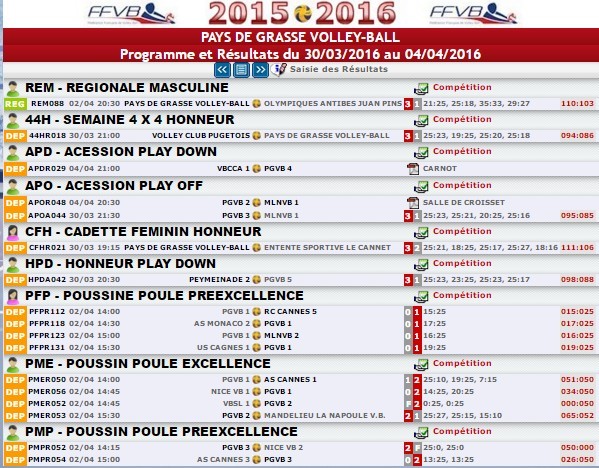 Voilà les résultats pour ce week-end : Victoire des régio masculins 3 sets à 1 contre Antibes (21:25, 25:18, 35:33, 29:27), bravo ! les N3 n'ont qu'à refaire pareil samedi prochain à Antibes !!