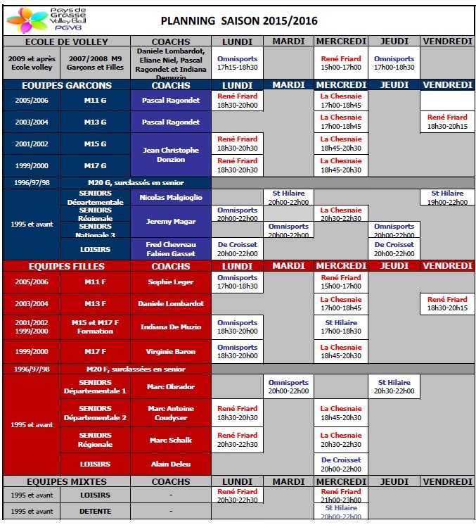 Voici un récapitulatif de l'ensemble des créneaux d'entrainements proposés par le PGVB cette année 2015 / 2016 !!