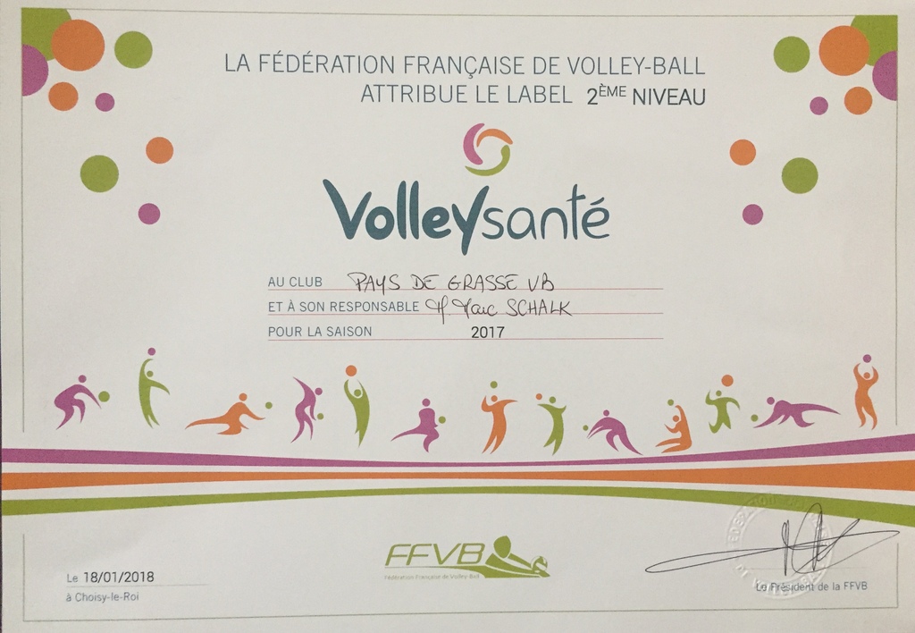 Suite à notre action de développement des différentes activités avec notamment la pratique du Soft Volley la saison dernière (en espèrant pouvoir relancer l'activité prochainement), nous avons le plaisir de vous annoncer que le Pays de Grasse Volley-Ball vient de se faire attribuer le Label Volley Santé 2ème Niveau par la Fédération Française de Volley-Ball !!!